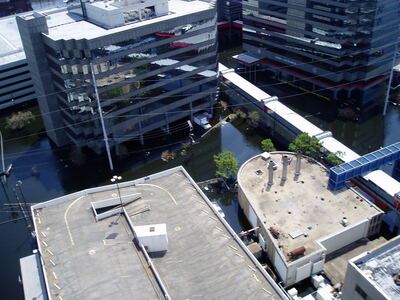 Aerial view of old Hotel Dieu parking garage, power plant , with Resource Center building and elevated walkway.