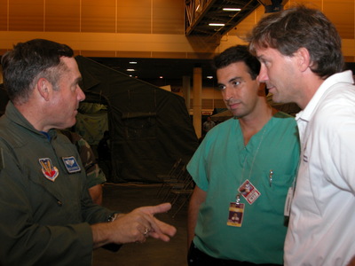 Brig. Gen. (Dr.) Russell J. Kilpatrick speaking with James Moises and Peter Deblieux, Combat Support Hospital at the Poland Street Wharf, New Orleans.