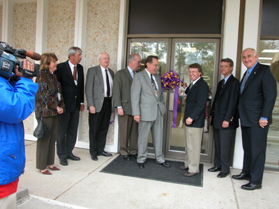 Group photo in front of newly reopened building on LSUHSC-NO Dental School campus. Group includes (l. to r.) Dr. Elizabeth Fontham, Dr. Joseph Moerschbaecher, (unknown), (unknow), Dr. Randolph Malloy, Dr. Eric Hovland, Dr. James Cairo, and LSU President Bill Jenkins.